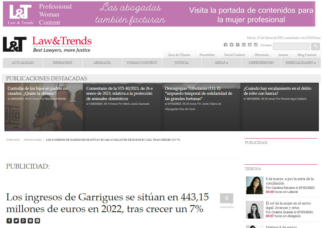 Los ingresos de Garrigues se sitúan en 443,15 millones de euros en 2022, tras crecer un 7%
