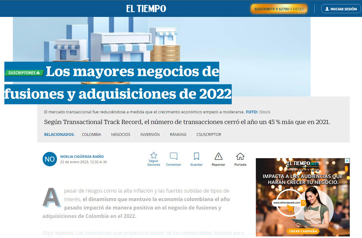 A pesar de riesgos como la alta inflación y las fuertes subidas de tipos de interés, el dinamismo que mantuvo la economía colombiana el año pasado impactó de manera positiva en el negocio de fusiones y adquisiciones de Colombia en el 2022.