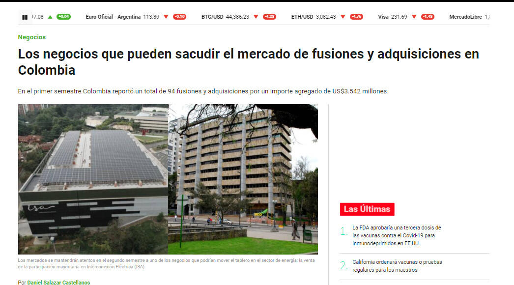 En el primer semestre Colombia reportó un total de 94 fusiones y adquisiciones por un importe agregado de US$3.542 millones.