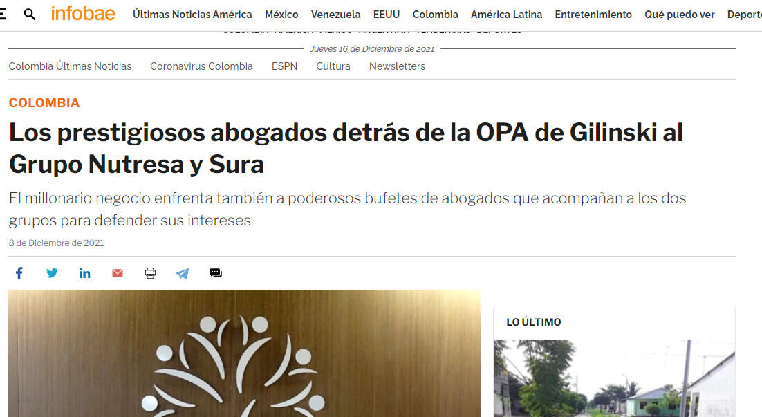 De acuerdo con el diario El Tiempo, en este proceso el abogado José Luis Suárez Parra le habla al oído a Jaime Gilinski, líder del grupo familiar que lanzó la OPA por Nutresa y el Grupo Sura, la primera en la que los banqueros están acompañados por la empresa emiratí Royal Group.