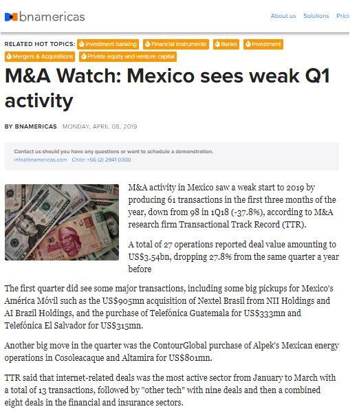 M&A activity in Mexico saw a weak start to 2019 by producing 61 transactions in the first three months of the year, down from 98 in 1Q18 (-37.8%), according to M&A research firm Transactional Track Record (TTR).
