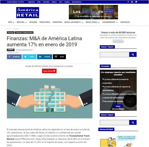 El mercado transaccional de América Latina ha registrado en el mes de enero un total de 151 operaciones, de las cuales 56 tienen un importe no confidencial que suman aproximadamente USD 7.488m, según el más reciente informe de Transactional Track Record (www.TTRecord.com). Estas cifras implican un descenso del 8,48% en el número de operaciones y un alza del 17,15% en el importe de estas, con respecto a enero de 2018.