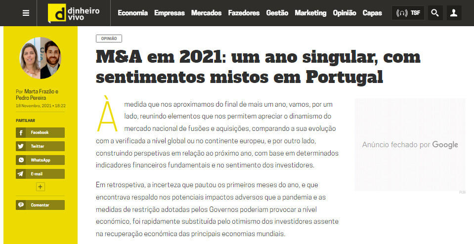 M&A em 2021: um ano singular, com sentimentos mistos em Portugal