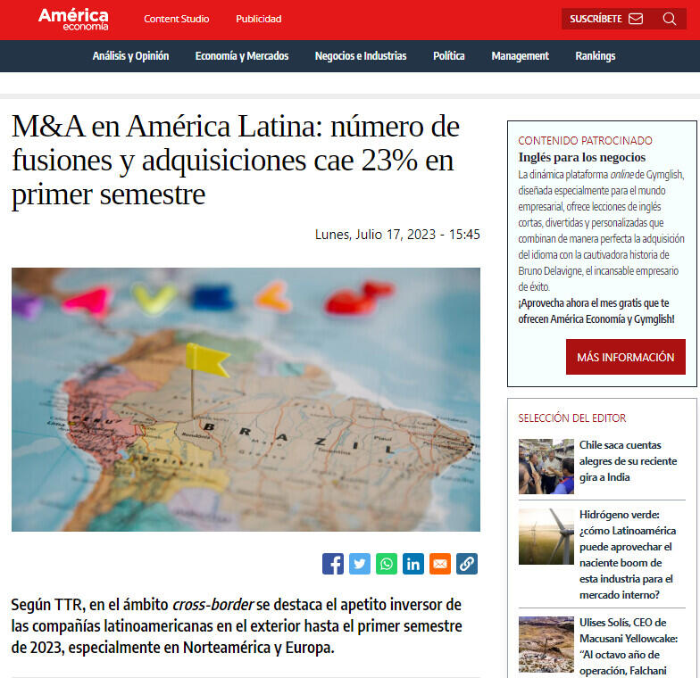 Según TTR, en el ámbito cross-border se destaca el apetito inversor de las compañías latinoamericanas en el exterior hasta el primer semestre de 2023, especialmente en Norteamérica y Europa.