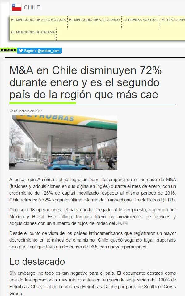 Sin embargo, no todo es tan negativo para el país. El documento destacó como una de las operaciones más interesantes en la región la adquisición del 100% de Petrobras Chile, filial de la brasilera Petrobras Caribe por parte de Southern Cross Group.