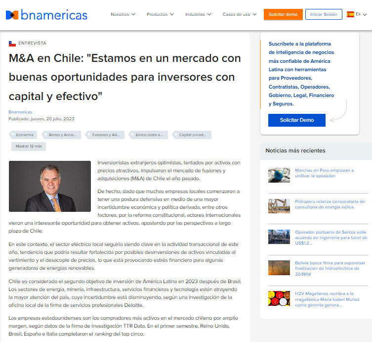 M&A en Chile:"Estamos en un mercado con buenas oportunidades para inversores con capital y efectivo"