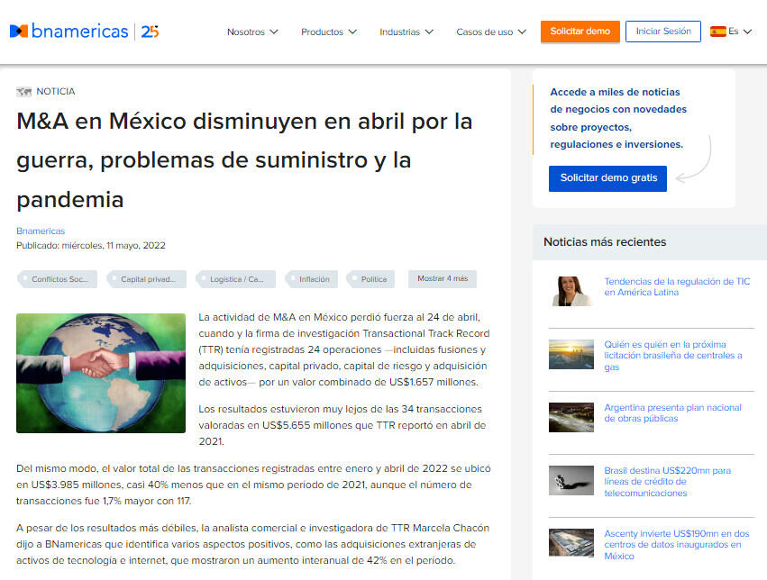 a actividad de M&A en México perdió fuerza al 24 de abril, cuando y la firma de investigación Transactional Track Record (TTR) tenía registradas 24 operaciones —incluidas fusiones y adquisiciones, capital privado, capital de riesgo y adquisición de activos— por un valor combinado de US$1.657 millones.