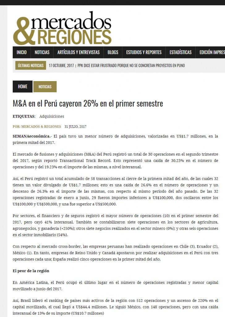 El mercado de fusiones y adquisiciones (M&A) del Perú registró un total de 30 operaciones en el segundo trimestre del 2017, según reportó Transactional Track Record. Esto representó una caída de 30.23% en el número de operaciones y del 19.23% en el importe de las mismas, a nivel interanual.