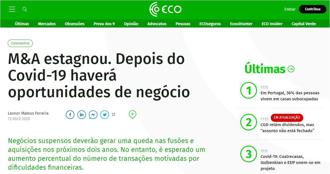 O surto de Covid-19 fez estagnar praticamente todas as operações de fusões e aquisições (M&A na sigla em inglês) em Portugal. Já foram cancelados alguns negócios e, nos que estão em aberto, a estratégia deverá ser de esperar para ver. No entanto, após a paralisação, poderá haver oportunidades de negócio.