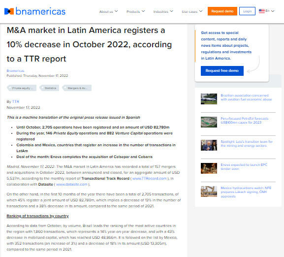 Madrid, November 17, 2022- The M&A market in Latin America has recorded a total of 157 mergers and acquisitions in October 2022, between announced and closed, for an aggregate amount of USD 5,537m, according to the monthly report of Transactional Track Record ( www.TTRecord.com ), in collaboration with Datasite ( www.datasite.com ).