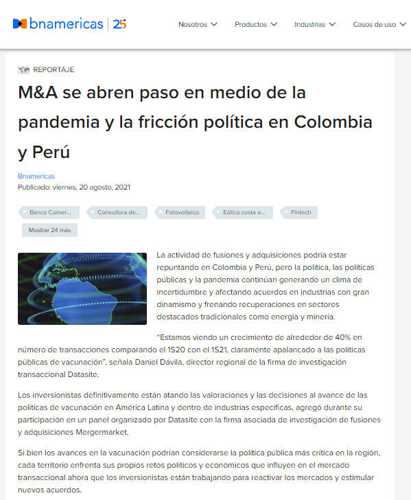 “Estamos viendo un crecimiento de alrededor de 40% en número de transacciones comparando el 1S20 con el 1S21, claramente apalancado a las políticas públicas de vacunación”, señala Daniel Dávila, director regional de la firma de investigación transaccional Datasite.