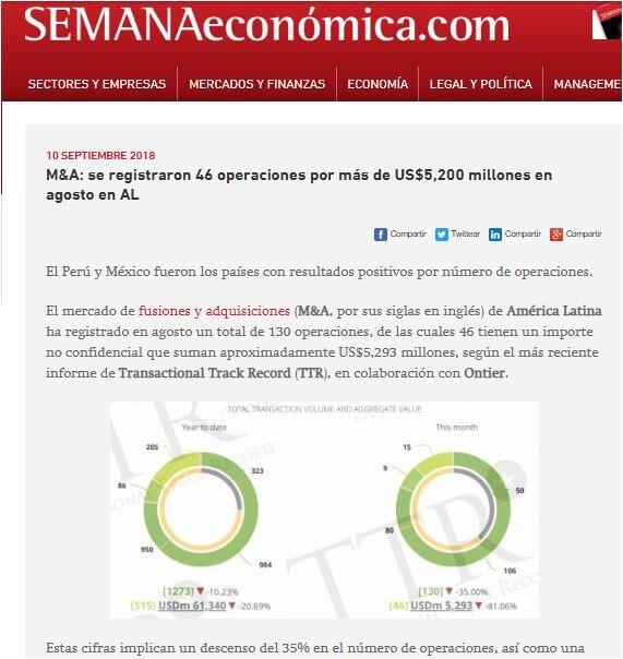 El mercado de fusiones y adquisiciones (M&A, por sus siglas en inglés) de América Latinaha registrado en agosto un total de 130 operaciones, de las cuales 46 tienen un importe no confidencial que suman aproximadamente US$5,293 millones, según el más reciente informe de Transactional Track Record (TTR), en colaboración con Ontier.