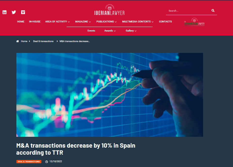 Finally, TTR has set out its ranking of financial advisors in the M&A market up to Q3 2022. In terms of amount, it is led by Rothschild and Banco Santander, with €8,021.22m and €6,689.16m, respectively. The ranking by number of transactions is led by Banco Santander and Arcano Partners, with 16 transactions each.