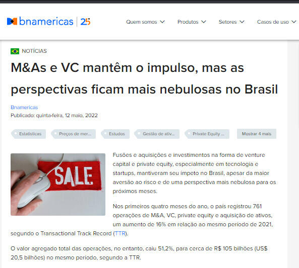 Nos primeiros quatro meses do ano, o país registrou 761 operações de M&A, VC, private equity e aquisição de ativos, um aumento de 16% em relação ao mesmo período de 2021, segundo o Transactional Track Record (TTR).