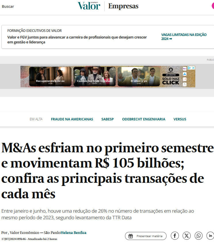 Confira as 3 principais transações dos seis primeiros meses do ano — considerando o valor do negócio, segundo a TTR Data: