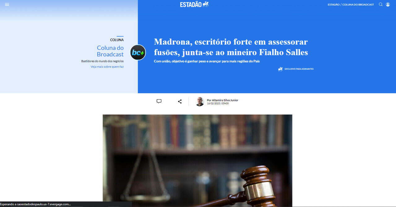 Um dos escritórios de advocacia de São Paulo mais conhecidos no segmento de fusões e aquisições de empresas (M&A, na sigla em inglês), o Madrona costuma prestar serviços em grandes operações, como a recente combinação de negócios entre Hapvida e NotreDame Intermédica. Agora, o próprio escritório resolveu se fundir a outro, o mineiro Fialho Salles, forte em áreas como infraestrutura e comércio internacional. A nova banca nasce com 266 profissionais, incluindo 39 sócios, e a meta de dobrar de tamanho em cinco anos.