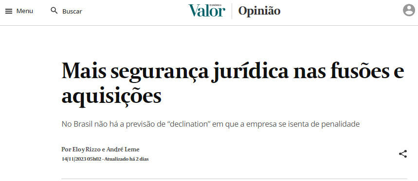 O anúncio foi feito por meio da procuradora-geral do órgão, Lisa Monaco, e representa importante avanço sobre responsabilidade sucessória por irregularidades ocorridas em momento anterior à operação societária. Isso porque as empresas que reportarem ao DOJ a existência de eventual irregularidade na adquirida em até seis meses após o fechamento da operação poderão obter o “declination” - na prática, o governo dos EUA deixa de tomar qualquer medida em desfavor da empresa.