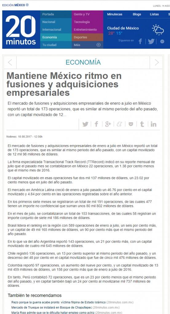 La firma especializada Transactional Track Record (TTRecord) indicó en su reporte mensual de julio que el pasado mes se contabilizaron en México 22 operaciones, un 1.38 por ciento menos que el mismo mes de 2016.