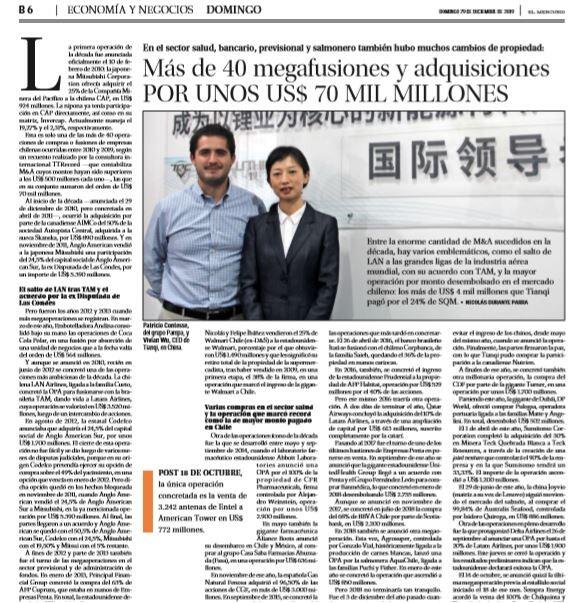 Esta es solo una de las más de 40 operaciones de compras o fusiones de empresas chilenas ocurridas entre 2010 y 2019, según un recuento realizado por la consultora internacional TTRecord —que contabiliza M&A cuyos montos hayan sido superiores alos US$ 500 millones cada uno—, las que en su conjunto sumaron del orden de US$ 70 mil millones. Al inicio de la década —anunciada el 29 de diciembre de 2010, pero concretada en abril de 2011—, ocurrió la adquisición por parte de la canadiense AIMCo del 50% de la sociedad Autopista Central, adquirida a la sueca Skanska, por US$ 890 millones.