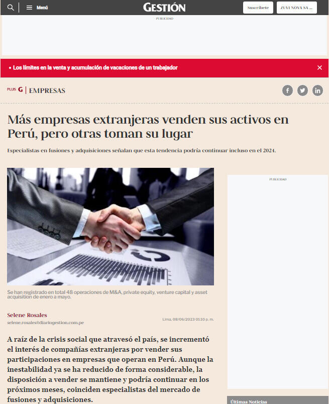 A raíz de la crisis social que atravesó el país, se incrementó el interés de compañías extranjeras por vender sus participaciones en empresas que operan en Perú. Aunque la inestabilidad ya se ha reducido de forma considerable, la disposición a vender se mantiene y podría continuar en los próximos meses, coinciden especialistas del mercado de fusiones y adquisiciones.