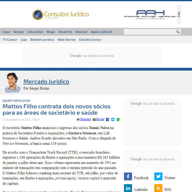 O escritório Mattos Filho anunciou o ingresso dos sócios Tomás Neiva na prática de Societário/Fusões e Aquisições, e Gustavo Swenson, em Life Sciences e Saúde. Ambos ficarão alocados em São Paulo. Com a chegada de Neiva e Swenson, a banca soma 119 sócios.