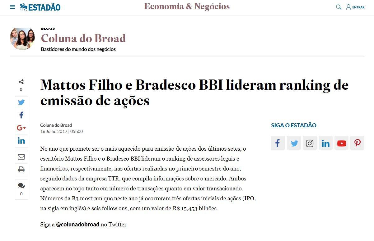 No ano que promete ser o mais aquecido para emissão de ações dos últimos sete, o escritório Mattos Filho e o Bradesco BBI lideram o ranking de assessores legais e financeiros, respectivamente, nas ofertas realizadas no primeiro semestre do ano, segundo dados da empresa TTR, que compila informações sobre o mercado. Ambos aparecem no topo tanto em número quanto em valor transacionado.