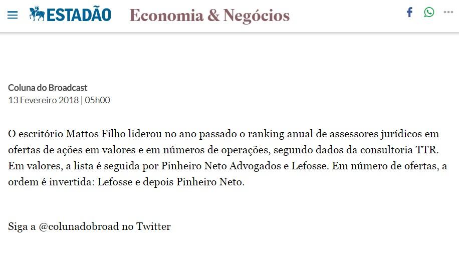 O escritório Mattos Filho liderou no ano passado o ranking anual de assessores jurídicos em ofertas de ações em valores e em números de operações, segundo dados da consultoria TTR. Em valores, a lista é seguida por Pinheiro Neto Advogados e Lefosse. Em número de ofertas, a ordem é invertida: Lefosse e depois Pinheiro Neto.