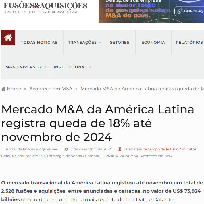 Mercado M&A da América Latina registra queda de 18% até novembro de 2024