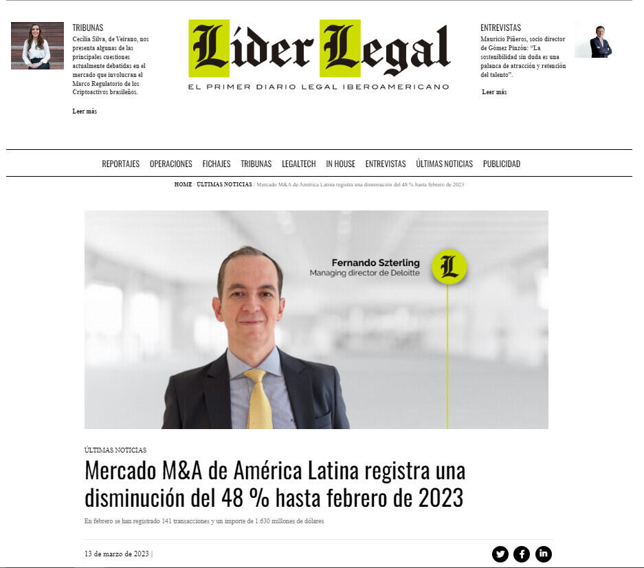 Mercado M&A de América Latina registra una disminución del 48% hasta febrero de 2023