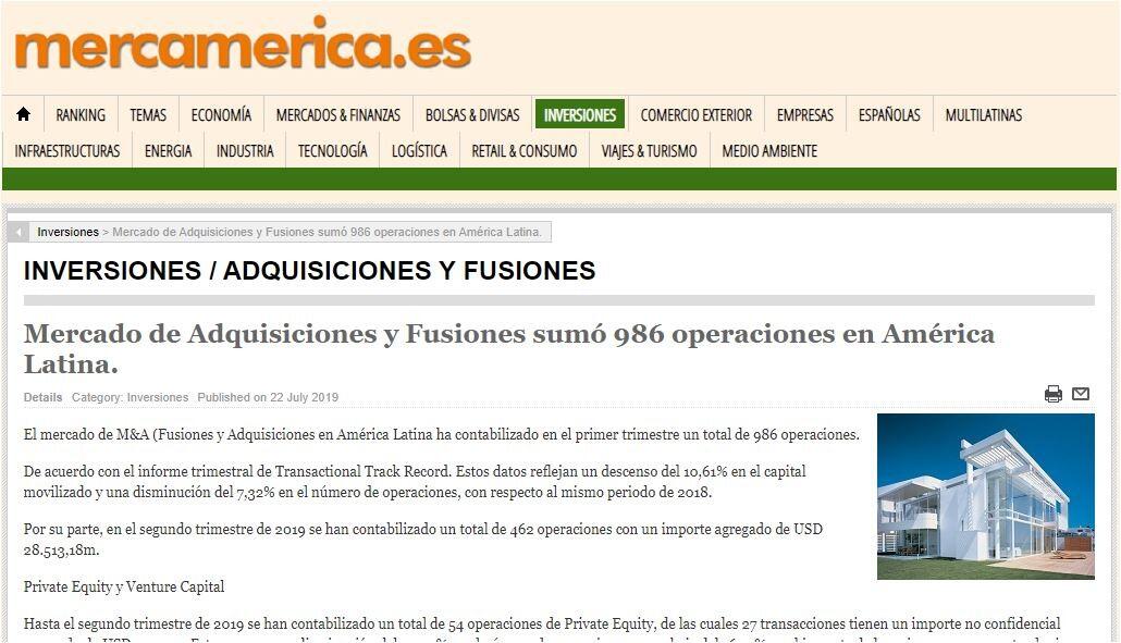 De acuerdo con el informe trimestral de Transactional Track Record. Estos datos reflejan un descenso del 10,61% en el capital movilizado y una disminución del 7,32% en el número de operaciones, con respecto al mismo periodo de 2018.