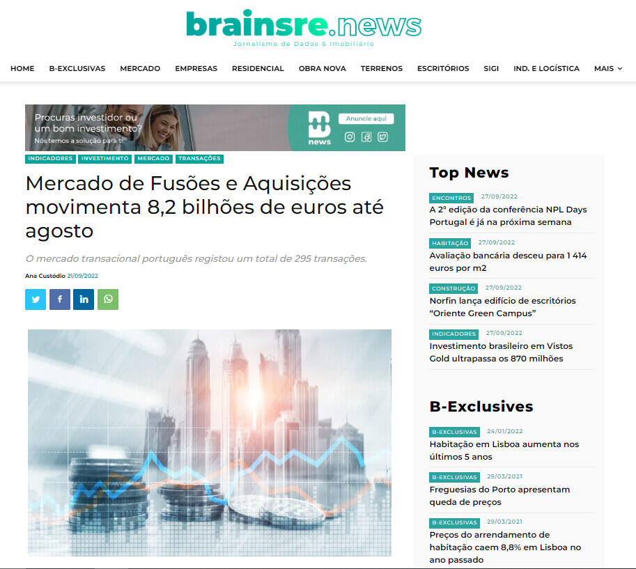 Até agosto de 2022 foram registadas 295 transações, o volume de operações regista diminuição de 19% em comparação a 2021 São estes os dados do mais recente relatório do TTR (Transactional Track Record), que indica que o Setor de Real Estate foi o mais ativo no período, com 72 transações. Do total das transações, 47% possuem os valores revelados.