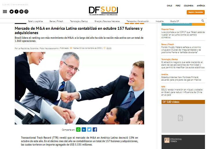 Transactional Track Record (TTR) reveló que el mercado de M&A en América Latina decreció 13% en octubre de este año. En el décimo mes del año se contabilizaron un total de 157 fusiones y adquisiciones, las cuales tuvieron un importe agregado de US$ 5.535 millones.