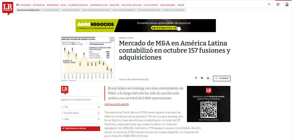 "Argentina, por su parte, continúa en quinto lugar en el ranking y registra 153 transacciones (un descenso del 13%), y un descenso del 66% en el capital movilizado (US$ 3.837 millones). En último lugar, Perú presenta 92 operaciones (baja del 16%) y un descenso del 43% en el capital movilizado (US$ 1.894 millones)", aseguró TTR.