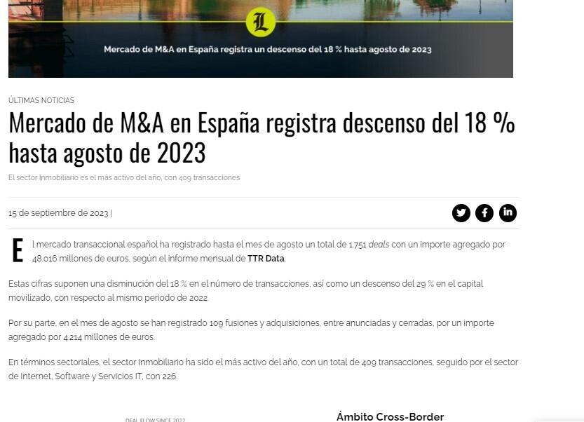 En agosto de 2023, TTR Data ha seleccionado como transacción destacada la adquisición de Expal Systems, por parte de Rheinmetall, empresa tecnológica alemana, por un importe de aproximadamente 1.200 millones de euros.