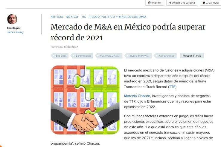 El mercado mexicano de fusiones y adquisiciones (M&A) tuvo un comienzo dispar este año después del récord anotado en 2021, según datos de enero de la firma Transactional Track Record (TTR). Marcela Chacón, investigadora y analista de negocios de TTR, dijo a BNamericas que hay razones para estar optimistas en 2022. Con muchos factores externos en juego, es difícil hacer predicciones específicas sobre el volumen de negocios de este año. “Lo que está claro es que este año los acuerdos en el mercado transaccional serán mayores que los de 2021 e, incluso, podrían a llegar a niveles de prepandemia” , señaló Chacón. TTR reportó 394 acuerdos —incluidas M&A, adquisiciones de activos y transacciones de capital privado y capital de riesgo— en México durante 2021 con un valor de acuerdo divulgado que asciende a US$19.355 millones. Los resultados marcan un fuerte regreso después de la pandemia de 2020 con 25% más de transacciones y 78% más de valor informado. TTR registró 20 operaciones en enero con un valor de transacción divulgado que asciende a US$447 millones, lo que representa una caída de 5% en la cantidad de transacciones respecto del mismo mes de 2021, pero un alza de 137% en términos de valor. Chacón indicó que hay optimismo, no solo para México, sino para gran parte de América Latina. “Más aún cuando la actividad de M&A sigue desempeñando un papel fundamental para las compañías que se enfrentan a la disrupción tecnológica y a la creciente presión de los accionistas e inversores por crear valor en sus compañías” , destacó. “Sin duda, las transacciones de M&A en el sector de tecnología en México serán impulsadas por factores como empresas capitalizadas, sinergias operativas y comerciales y la transformación digital que se llevará a cabo en el mediano y largo plazo” , manifestó Chacón en términos de industrias específicas. Esta tendencia ya estaba en marcha antes de la pandemia, pero las operaciones relacionadas con activos tecnológicos y de internet se incrementaron en 2021 gracias al gran interés intersectorial de las empresas estadounidenses. De hecho, las adquisiciones de empresas mexicanas en EE.UU. aumentaron 88% a 141 el año pasado. Mientras tanto, TTR registró 113 acuerdos en el sector tecnológico en 2021, frente a los 63 de 2020 y los 65 de 2019, con un alza interanual de 44% en el número de adquisiciones entrantes de empresas extranjeras en el sector. Ayuda, dijo Chacón, que no solo las empresas tecnológicas o de internet tengan que evolucionar rápidamente. “Varias empresas de sectores tradicionales de la economía que deben pasar por transformaciones digitales para mantener su negocio” , aseveró, y agregó que muchas buscan adquisiciones en subsectores florecientes, comprando empresas como fintechs y edtech. Las empresas están realizando adquisiciones en esas áreas “buscan agilizar dicho proceso o incluso reposicionar su producto, marca o incluso la forma de brindar nuevos servicios”. Estos “sin duda impulsarán el mercado transaccional” , añadió Chacón. Las transacciones de capital de riesgo y las adquisiciones de activos también seguirán desempeñando un papel clave en la conducción de acuerdos. TTR registró 167 transacciones de capital de riesgo en México el año pasado con un aumento de capital informado de US$4.767 millones. Estos reflejan un aumento del 61% en el número de transacciones y un aumento del 294% en el capital recaudado. En enero, TTR registró 11 acuerdos de capital de riesgo por un total de US$151 millones, lo que refleja un aumento interanual de 22% en el lado de las transacciones, mientras que el capital recaudado se disparó 1.046%