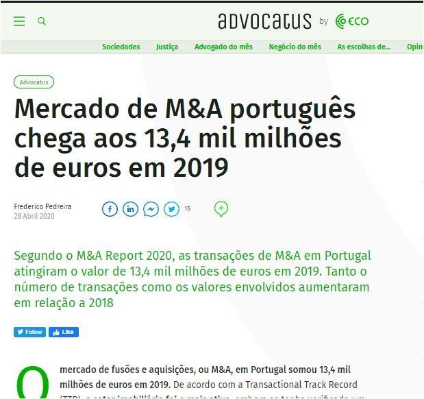 Segundo o M&A Report 2020, as transações de M&A em Portugal atingiram o valor de 13,4 mil milhões de euros em 2019. Tanto o número de transações como os valores envolvidos aumentaram em relação a 2018