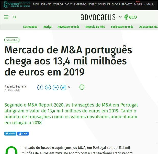 Segundo o M&A Report 2020, as transações de M&A em Portugal atingiram o valor de 13,4 mil milhões de euros em 2019. Tanto o número de transações como os valores envolvidos aumentaram em relação a 2018