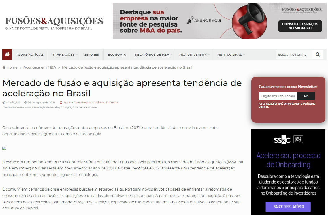 Mesmo em um período em que a economia sofreu dificuldades causadas pela pandemia, o mercado de fusão e aquisição (M&A, na sigla em inglês) no Brasil está em crescimento. O ano de 2020 já bateu recordes e 2021 apresenta uma tendência de aceleração principalmente em segmentos ligados à tecnologia.