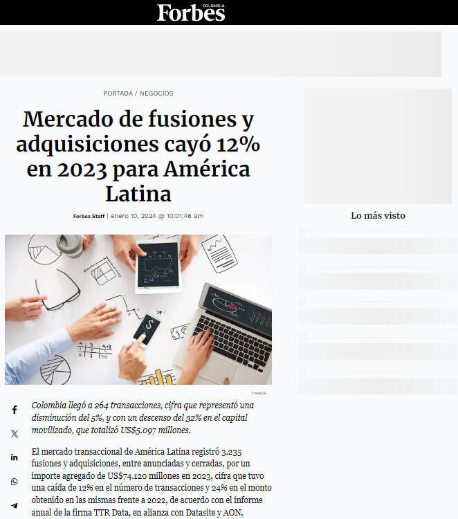 Mercado de fusiones y adquisiciones cayó 12% en 2023 para América Latina