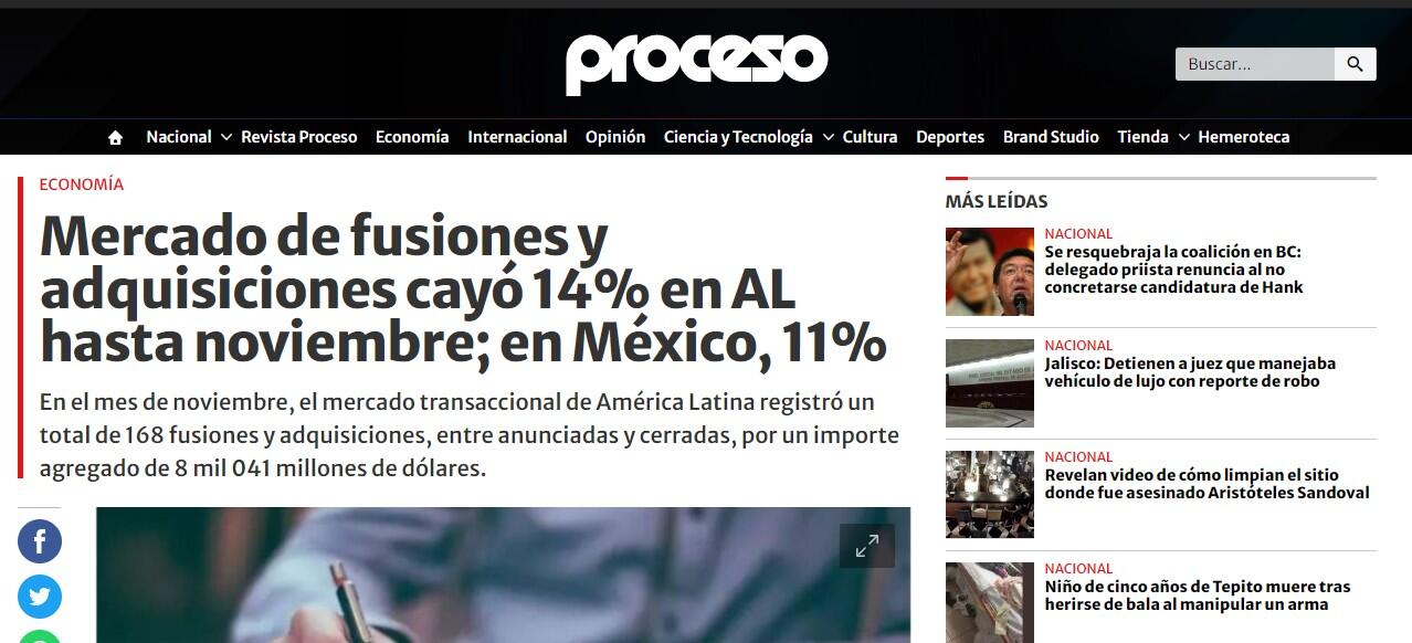 En el mes de noviembre, el mercado transaccional de América Latina registró un total de 168 fusiones y adquisiciones, entre anunciadas y cerradas, por un importe agregado de 8 mil 041 millones de dólares.