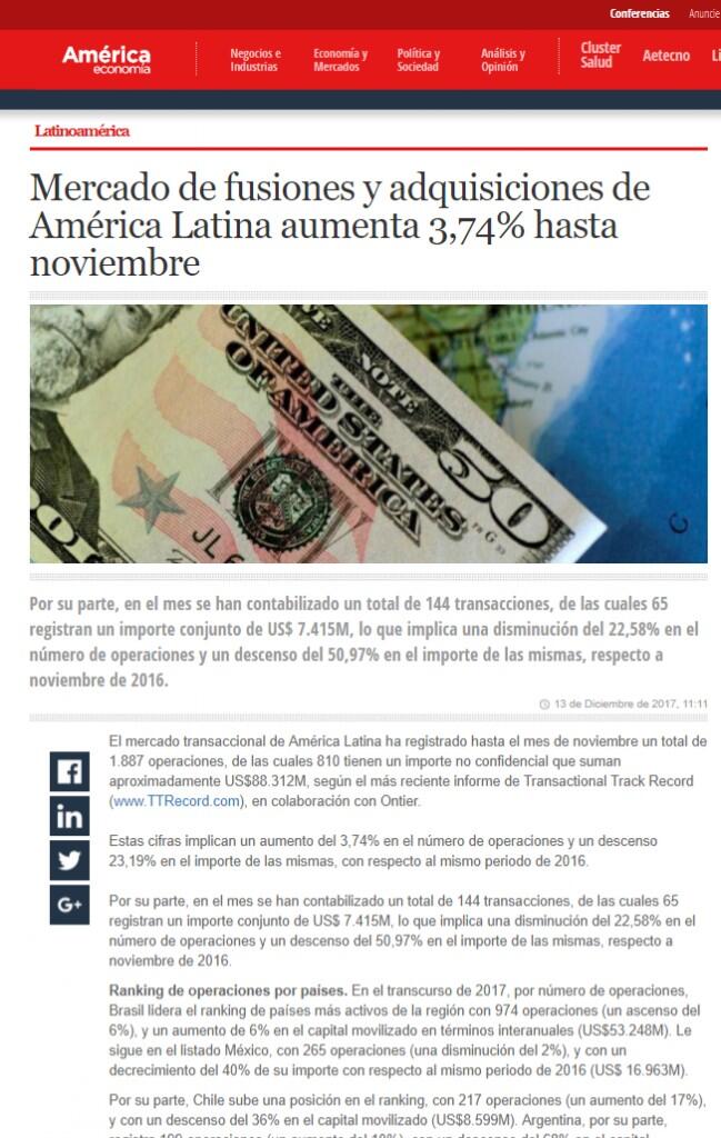 El mercado transaccional de América Latina ha registrado hasta el mes de noviembre un total de 1.887 operaciones, de las cuales 810 tienen un importe no confidencial que suman aproximadamente US$88.312M, según el más reciente informe de Transactional Track Record (www.TTRecord.com), en colaboración con Ontier.