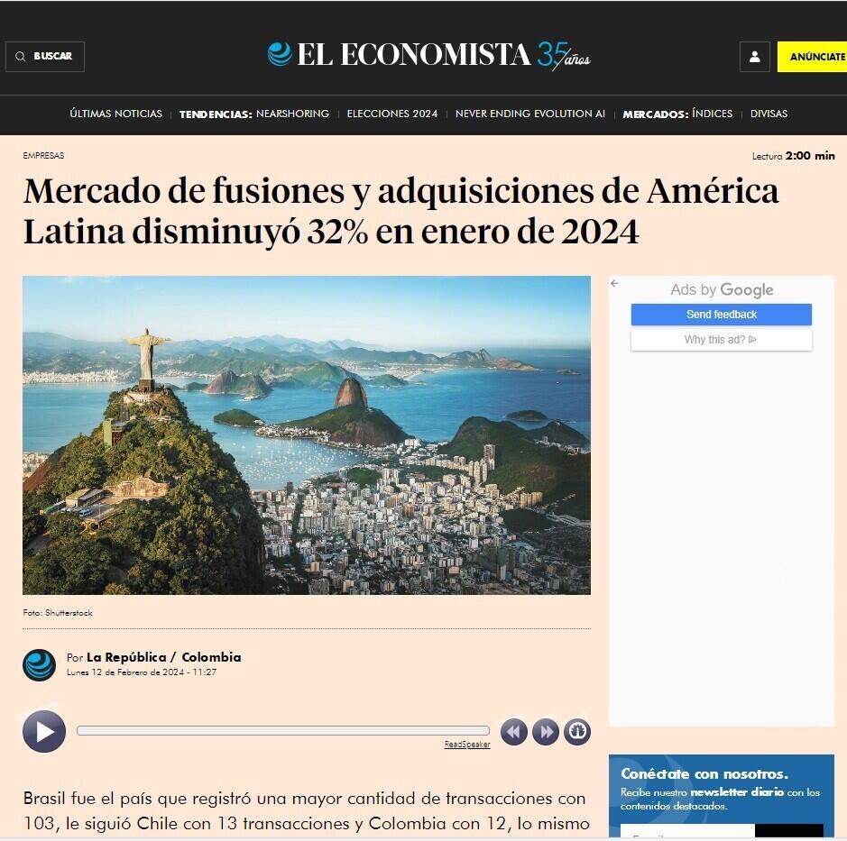 Mercado de fusiones y adquisiciones de América Latina disminuyó 32% en enero de 2024