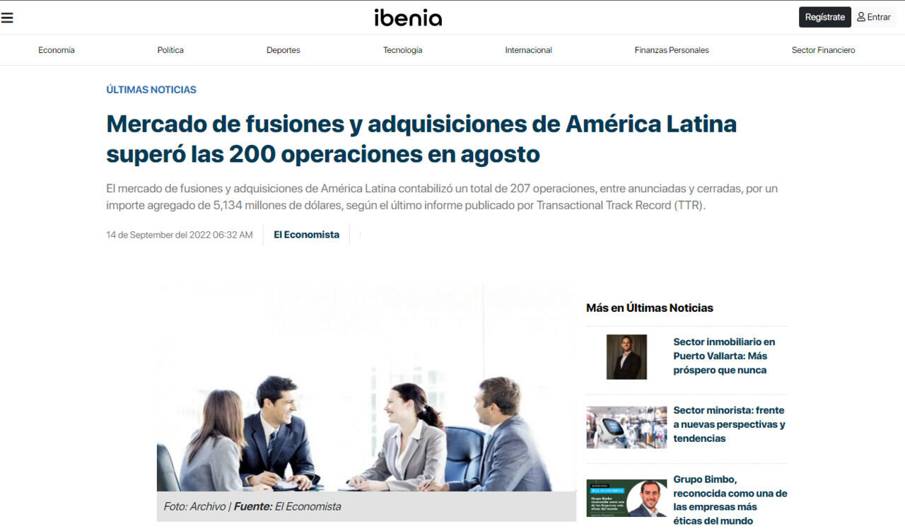 El mercado de fusiones y adquisiciones de América Latina contabilizó un total de 207 operaciones, entre anunciadas y cerradas, por un importe agregado de 5,134 millones de dólares, según el último informe publicado por Transactional Track Record (TTR).