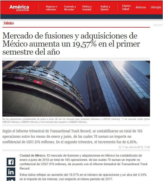 El mercado de fusiones y adquisiciones en México ha contabilizado de enero a junio de 2018 un total de 165 operaciones, de las cuales 70 suman un importe no confidencial de US$7.076 millones, de acuerdo con el informe trimestral de Transactional Track Record.