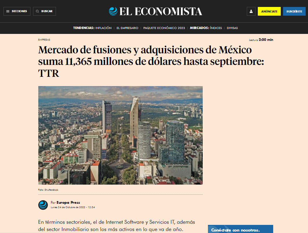 El mercado de fusiones y adquisiciones en México ha contabilizado hasta el tercer trimestre del año un total de 310 operaciones, de las cuales 152 suman un importe no confidencial de 11,365 millones de dólares, lo que supone un aumento del 8% en el número de operaciones y un descenso en el importe de las mismas con respecto al mismo periodo del 2021, según el informe trimestral de Transactional Track Record (TTR).