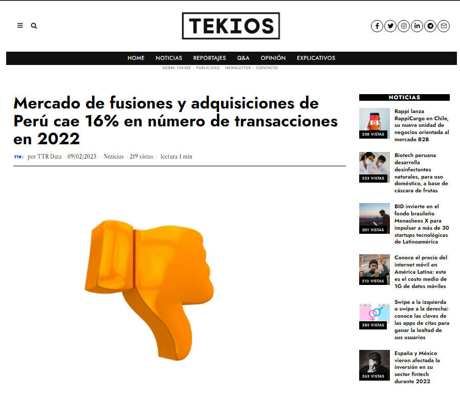 Mercado de fusiones y adquisiciones de Perú cae 16% en número de transacciones en 2022