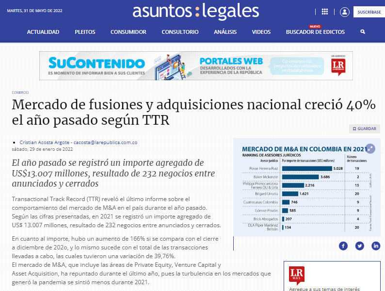 Mercado de fusiones y adquisiciones nacional creció 40% el año pasado según TTR