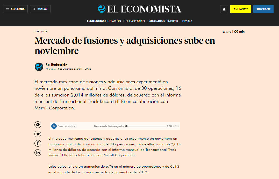 El mercado mexicano de fusiones y adquisiciones experimentó en noviembre un panorama optimista. Con un total de 30 operaciones, 16 de ellas sumaron 2,014 millones de dólares, de acuerdo con el informe mensual de Transactional Track Record (TTR) en colaboración con Merrill Corporation.