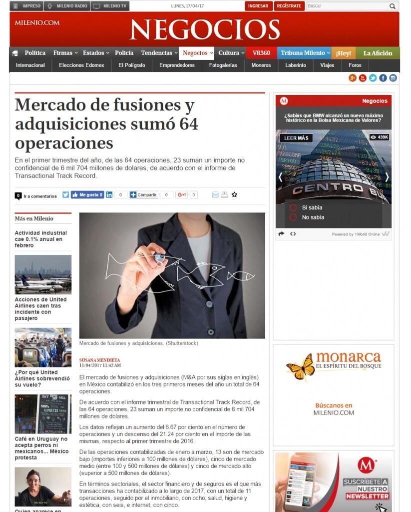 El mercado de fusiones y adquisiciones (M&A por sus siglas en inglés) en México ha contabilizado en los tres primeros meses del año un total de 64 operaciones.