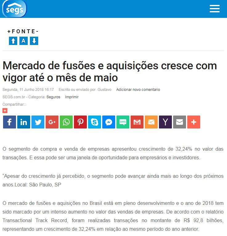O mercado de fusões e aquisições no Brasil está em pleno desenvolvimento e o ano de 2018 tem sido marcado por um intenso aumento no valor das vendas de empresas. De acordo com o relatório Transactional Track Record, foram realizadas transações no montante de R$ 92,8 bilhões, representando um crescimento de 32,24% em relação ao mesmo período do ano anterior.